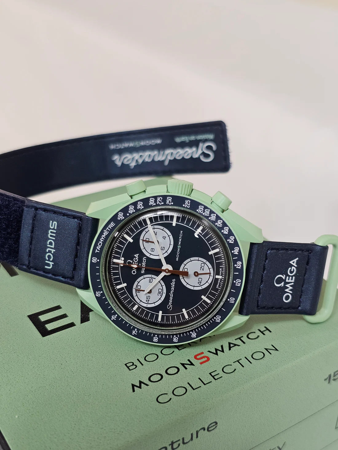 For eco-astronaut enthusiasts, this watch is a must-have. Its earthy green hue harmonises with a navy blue VELCRO© strap. The chronograph seconds hand and counter hands adopt a rich brown, while subdials are pristine white. The blue tachymeter scale on the bezel exudes a celestial charm. All dials proudly showcase OMEGA X SWATCH branding, the iconic Speedmaster logo, and the new MoonSwatch emblem.